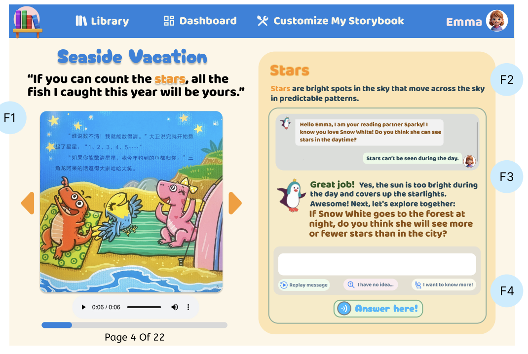 Sun, Y., Chen, J., Yao, B., Liu, J., Wang, D., Ma, X., Lu, Y., Xu, Y., & He, L. (2024). Exploring Parent's Needs for Children-Centered AI to Support Preschoolers' Interactive Storytelling and Reading Activities. Proceedings of the ACM on Human-Computer Interaction, 8(CSCW2), 1-25. HTML